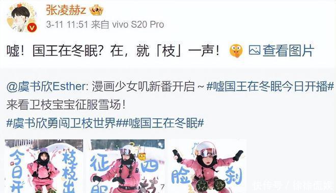 张凌赫在微博发文写下:嘘!国王在蛰伏?在,就枝一声!并附上虞书欣我方宣传《嘘,国王在蛰伏》的图文说合,就枝一声除了玩状声词谐音梗除外,也呼应虞书欣在《嘘,国王在蛰伏》的女主角姓名卫枝,发文充满巧念念。
